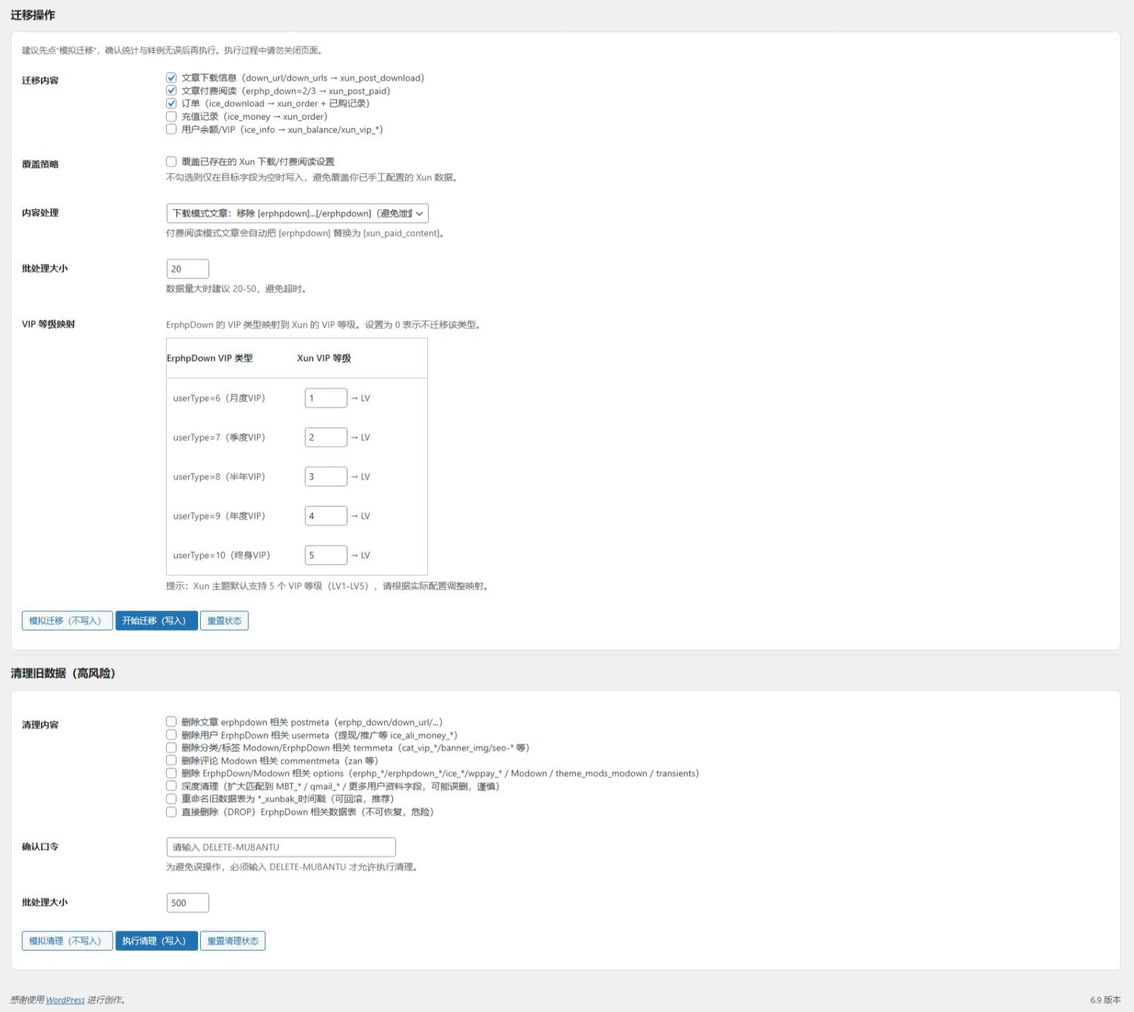 将 mubantu/erphpdown 与 modown 的下载/付费阅读/订单等数据迁移到 Xun 主题数据结构。