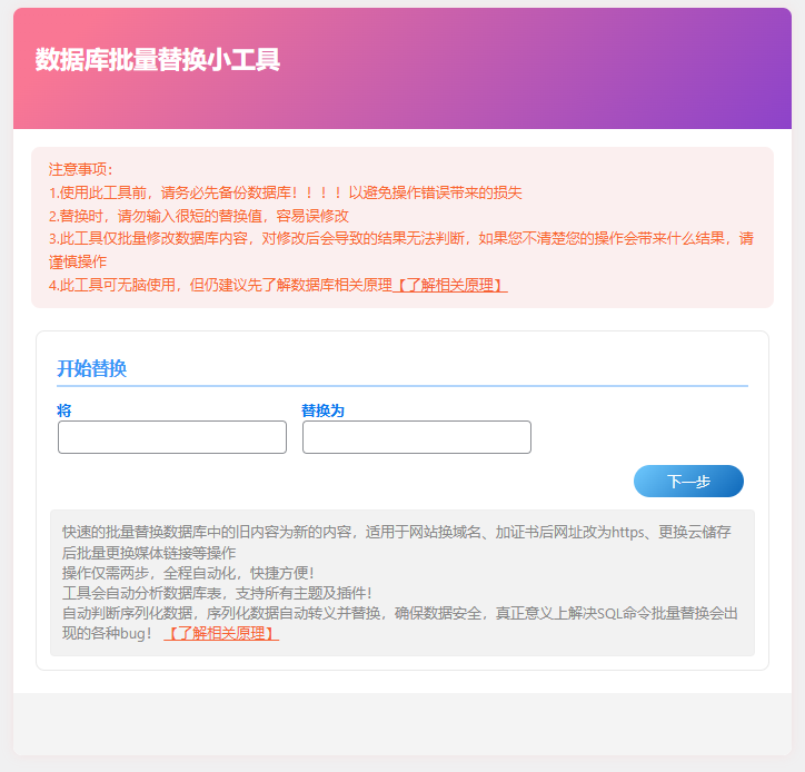 - 此工具仅批量修改数据库内容,对修改后会导致的结果无法判断,如果您不清楚您的操作会带来什么结果,请谨慎操作